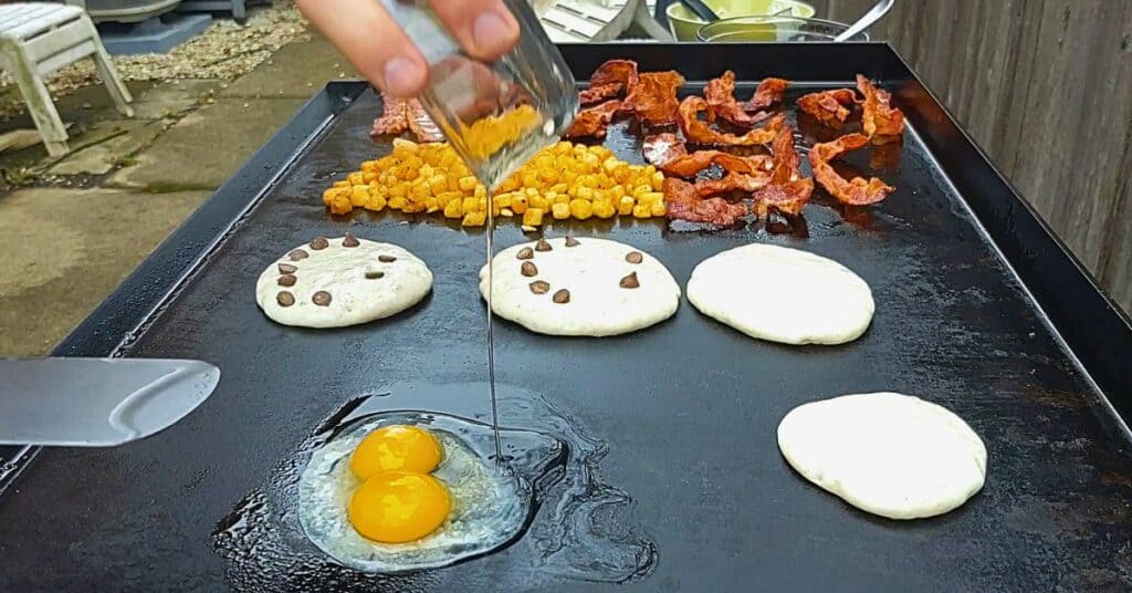 I prefer high smoke point oils like avocado or peanut oil because the griddle gets hot fast. Canola works fine too. The key is using something that won’t burn easily.